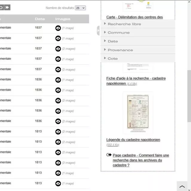 Pour rappel, si votre recherche porte sur la ville de Grenoble, vous devez vous rendre sur le site internet des Archives municipales et métropolitaines de Grenoble sur lequel vous pouvez consulter les plans mais également les matrices et états de sections.